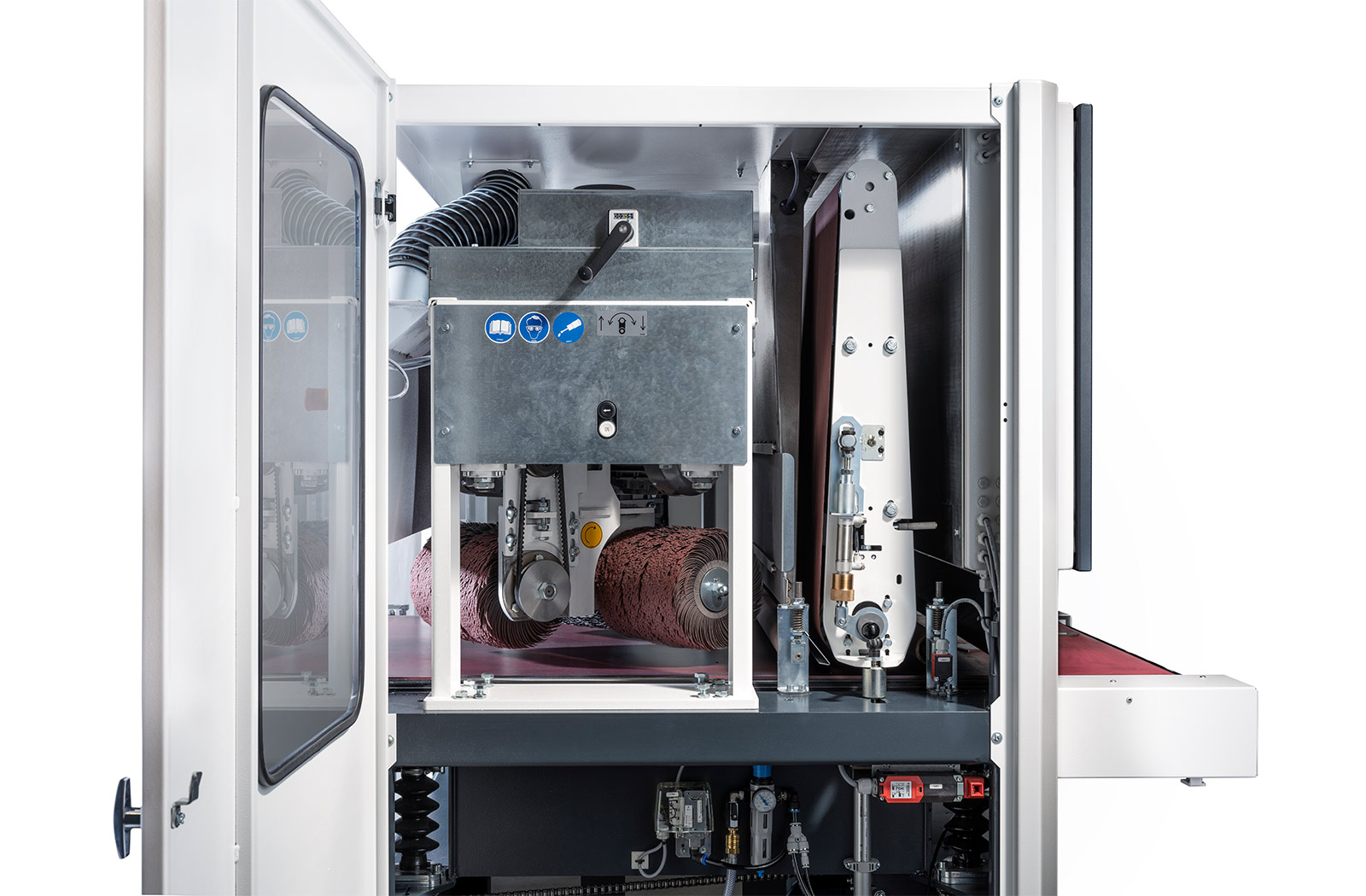 - Pneumatic tensioning of the abrasive belt